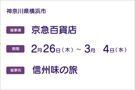 2026.02.24 催事情報 催事情報:2/26(木)~3/4(水) 京急百貨店 京急百貨店(神奈川県横浜市) 地下1階=食品催事場 2026年2月26日(木)~ 3月4日(水)7日間 「信州味の旅」